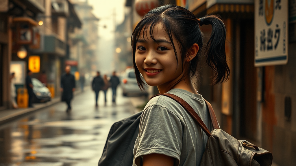 A young woman stands on the street, smiling softly with a backpack slung over her shoulder and her hair styled into neat ponytails. The scene captures an epic realism, featuring intricate and complex surroundings that hint at a story untold. The atmosphere is soaked, with the woman's clothes and hair wet, blending into the neutral colors that dominate the view. The scene is artfully faded, bringing an intricate world into focus while maintaining a cinematic vibe with warm and dramatic lighting. The background is richly detailed, evoking a sense of depth and complexity that draws the eye in. Despite subtle distortions that lend an otherworldly feel, there is a unique harmony between the detailed artwork and the vivid storytelling.