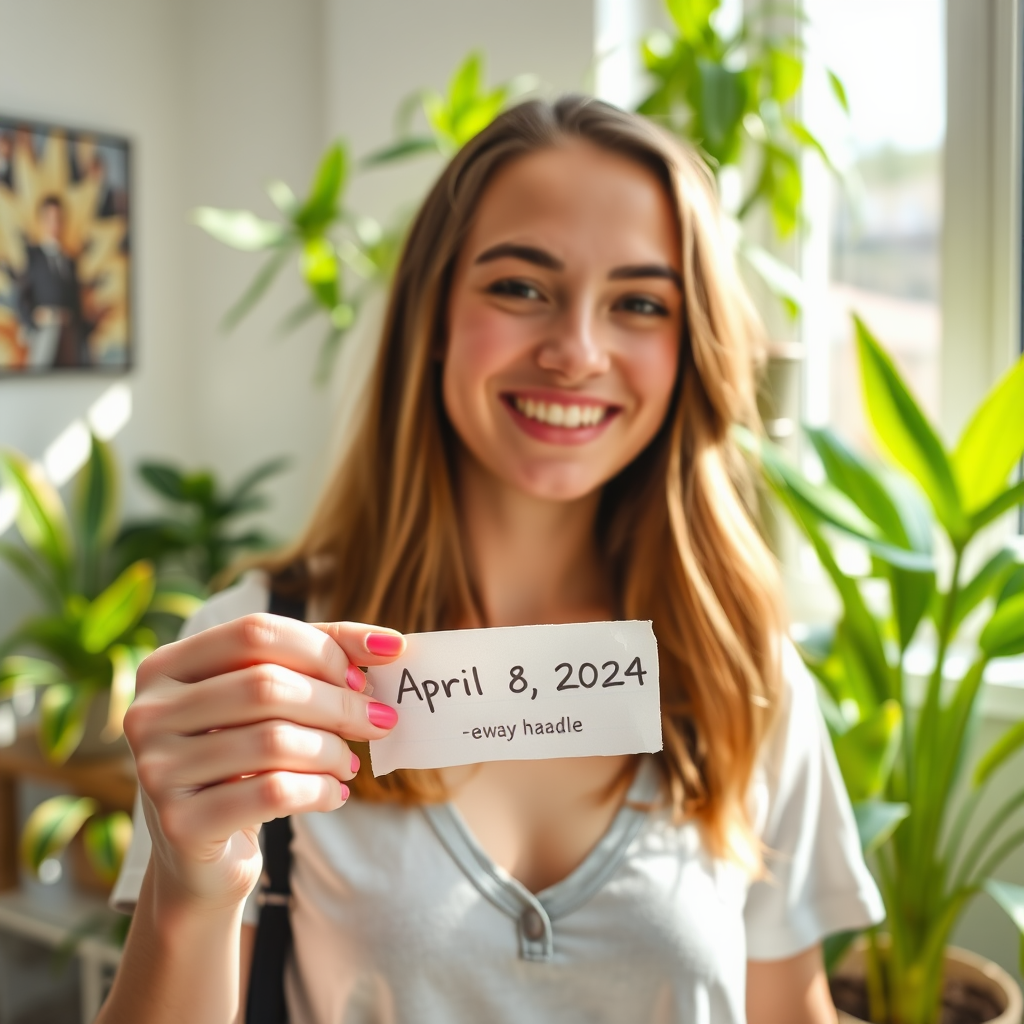 A young woman stands smiling, holding a small piece of paper in her hand that reads "April 8, 2024" followed by her unique handle. She is in a sunlit room with vibrant plants in the background, and her cheerful eyes reflect her excitement as the camera captures this candid moment.