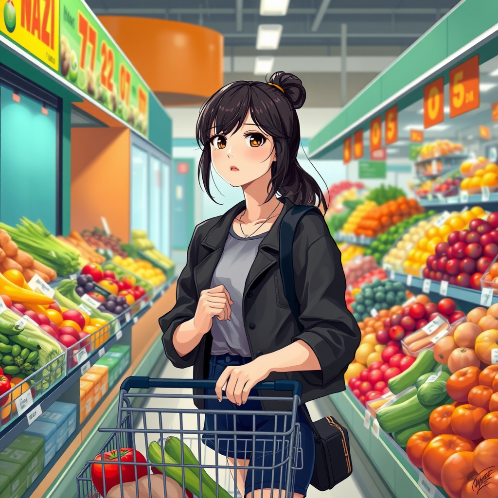A young woman stands thoughtfully in front of a colorful produce section, her cart filled with fresh groceries. She wears stylish urban attire, embodying a sense of modern city life. The scene is depicted in a vibrant digital illustration, showcasing high-quality fanart and cartoon digital painting. The art style draws inspiration from the works of artists like Guweiz and Bowater, capturing an anime aesthetic with detailed attention to the play of light and shadow. Her expression is one of contemplation as she decides on the freshest vegetables, with the bustling supermarket setting serving as a lively backdrop.