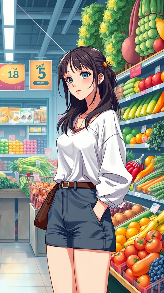 A young woman stands thoughtfully in front of a vibrant produce section, carefully selecting fresh groceries. She's depicted in a digital illustration characterized by intricate detail and vibrant colors. The style combines elements of anime with the dynamic flair of urban art, reminiscent of the works by artists Guweiz and Bowater. Her outfit is modern and chic, hinting at an urban lifestyle while blending seamlessly into the animated, high-quality fanart setting. Her expression is focused yet serene, embodying the everyday magic of city life amid the bustling backdrop of a supermarket.