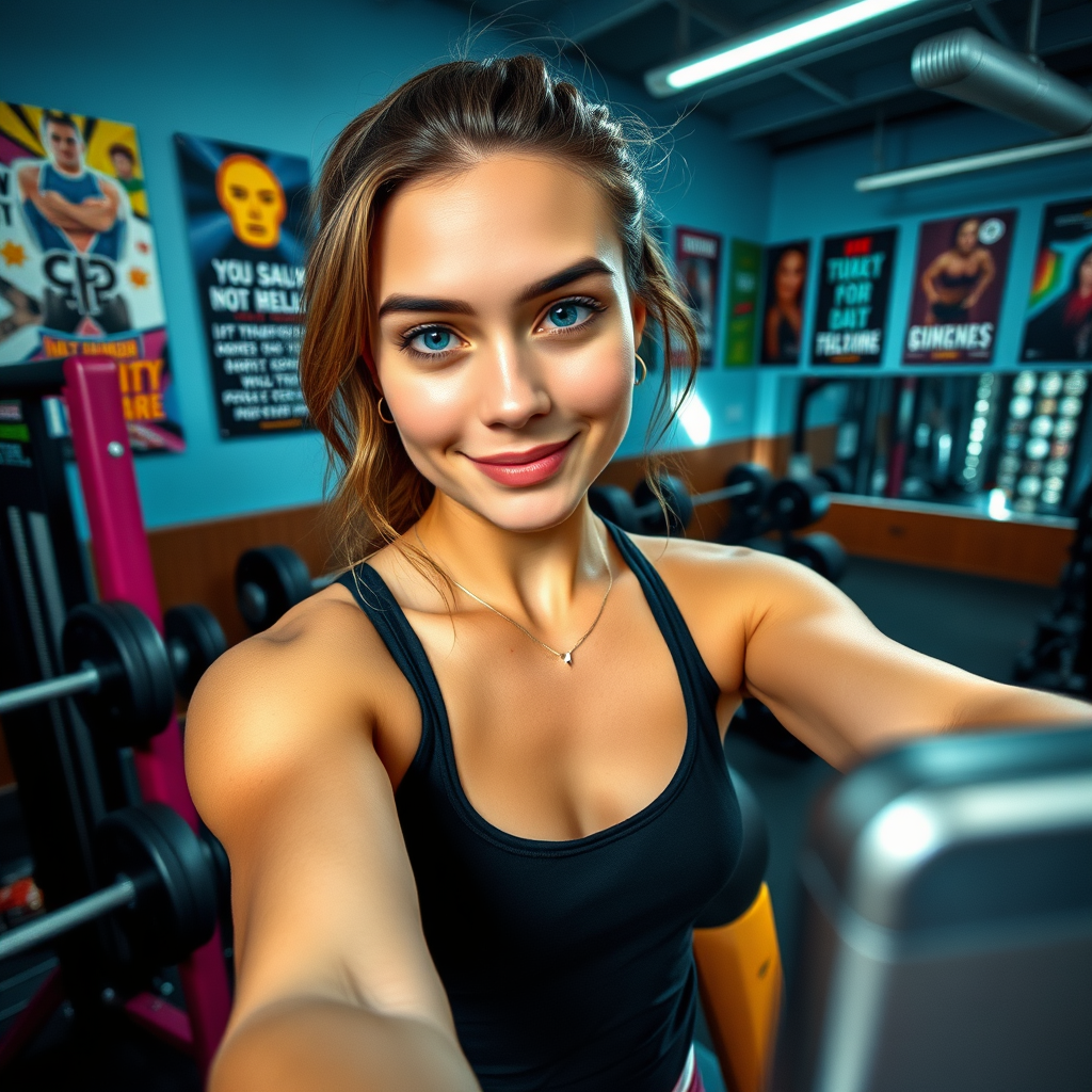 A young woman takes a casual selfie at the gym, vibrant energy surrounds her as motivational posters decorate the walls; her determination shines through amidst weights and exercise equipment, while subtle lighting accentuates her focused expression, capturing a moment of strength and ambition.