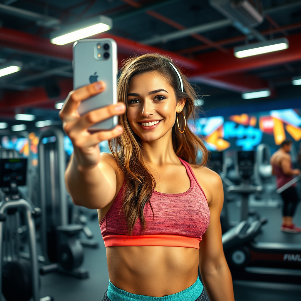 A young woman takes a selfie at a vibrant gym, capturing her confident smile and the bustling energy around her; she's surrounded by modern fitness equipment, the bright lights casting dynamic shadows, and her focus is palpable as she stands ready for an invigorating workout, wearing stylish, comfortable athletic wear that reflects her dynamic spirit, while the vivid colors and lively atmosphere create a sense of determination and vitality.
