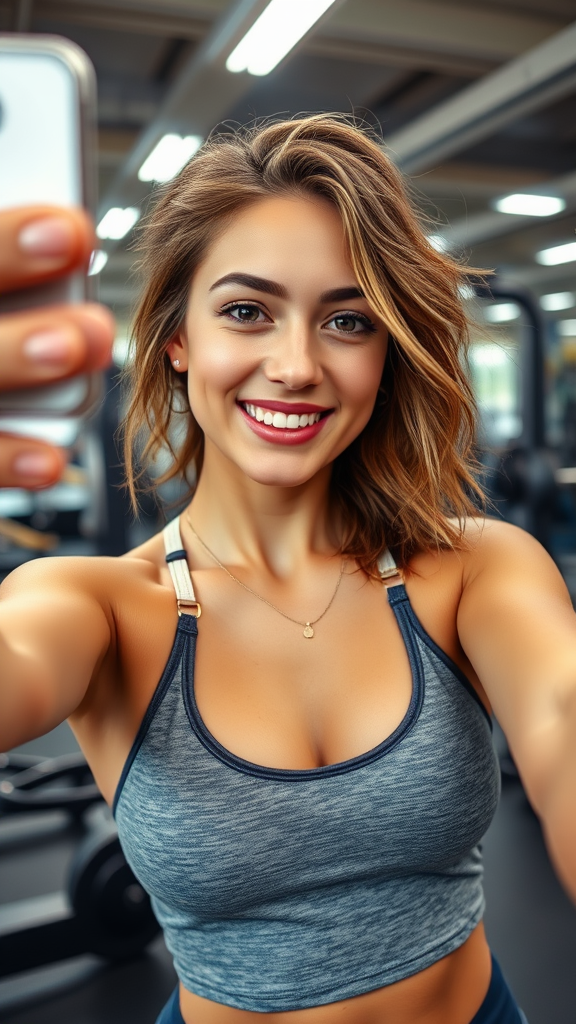 A young woman takes a selfie in a gym setting, capturing her enthusiastic expression and workout attire. She is surrounded by exercise equipment, which adds depth to the background. Her hair appears slightly tousled from the workout, giving a natural, energetic vibe. The image focuses on her confident pose and the well-lit, vibrant atmosphere of the gym, with no visible logos or text, allowing the scene to feel genuine and immersive.