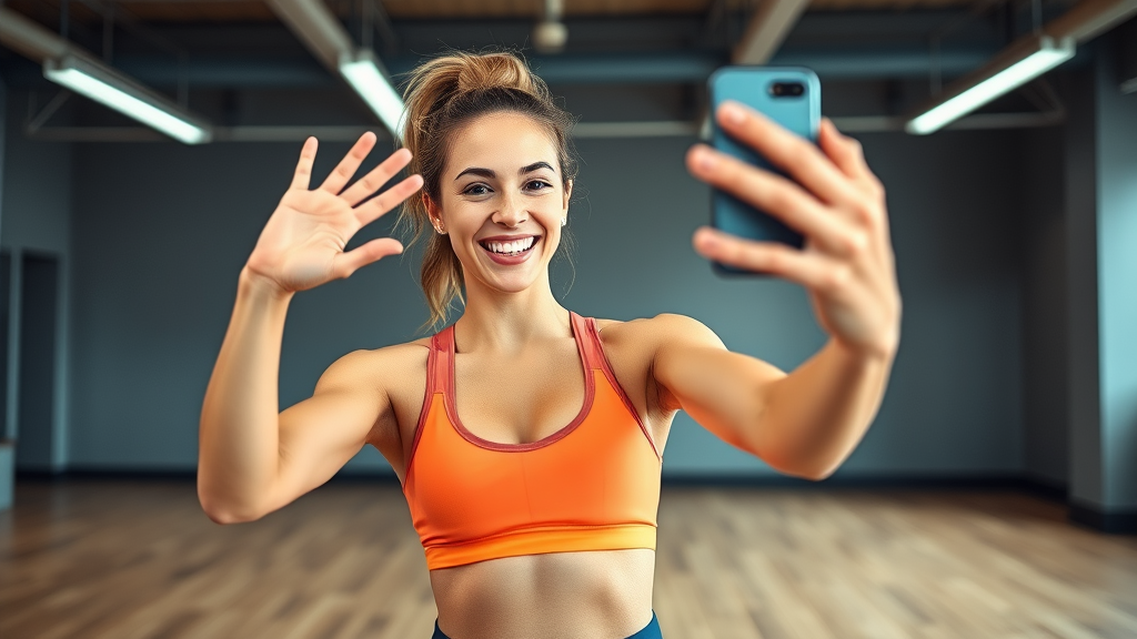 A young woman taking a selfie in a gym setting, highlighting her enthusiasm and energy, with vibrant workout gear and minimalistic, open background avoiding any visible logos or text, hands positioned naturally, capturing an authentic and positive moment.