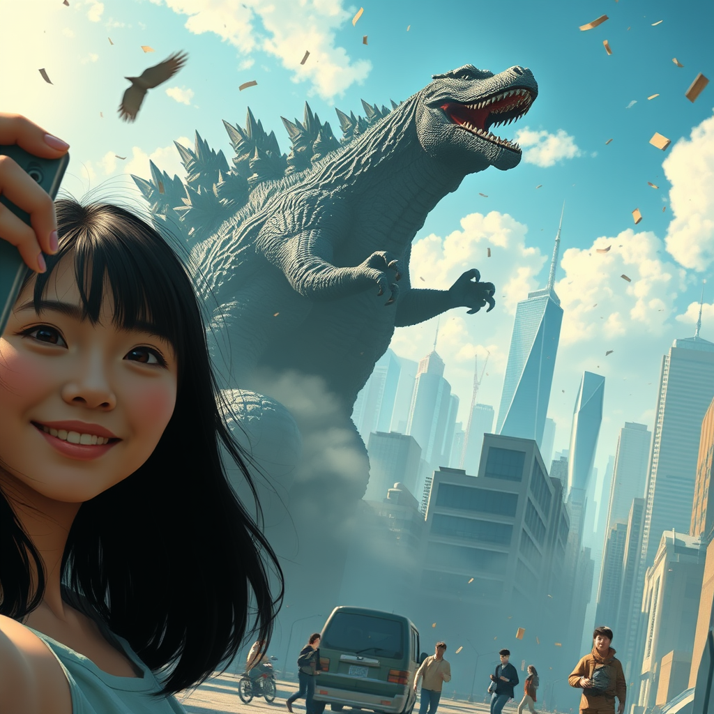 A young woman taking a selfie in the foreground while a massive, roaring Godzilla rampages through a cityscape in the background; citizens fleeing in panic, debris flying, and skyscrapers crumbling in a photorealistic style that combines the intricate detail of Beeple's digital art with the enchanting, whimsical touch of Studio Ghibli animations.