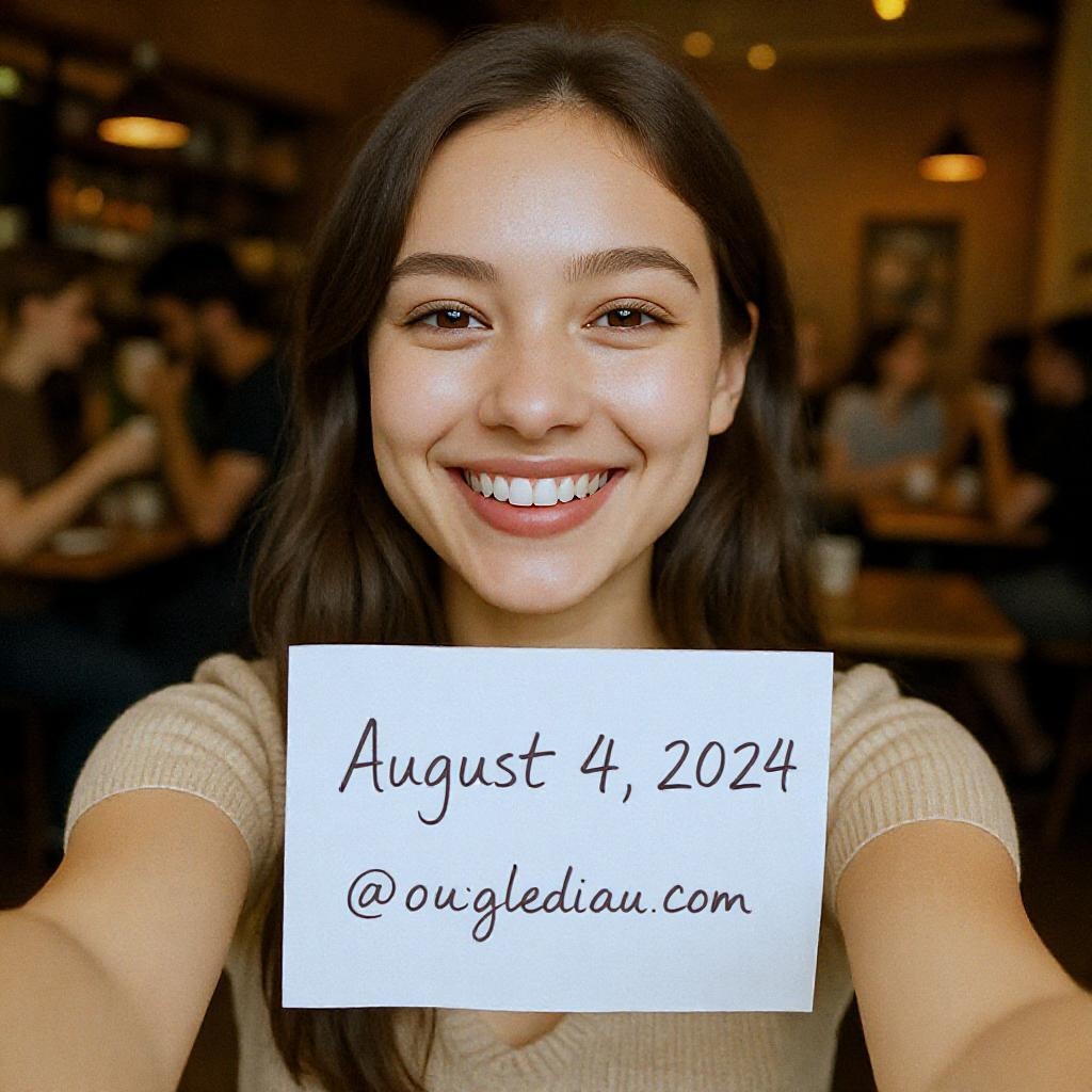 A young woman taking a selfie, smiling brightly as she holds a piece of paper with the date "August 4, 2024" and her social media handle written in neat, cursive handwriting. The background reveals a cozy coffee shop, filled with warm lighting and the faint blur of people chatting and sipping their drinks, creating a lively yet intimate atmosphere.