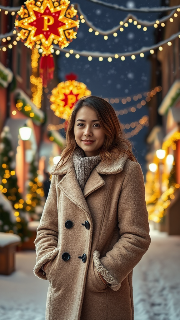 A young woman wearing a cozy winter coat stands amidst a festive, snow-covered scene, surrounded by twinkling lights and holiday decorations.