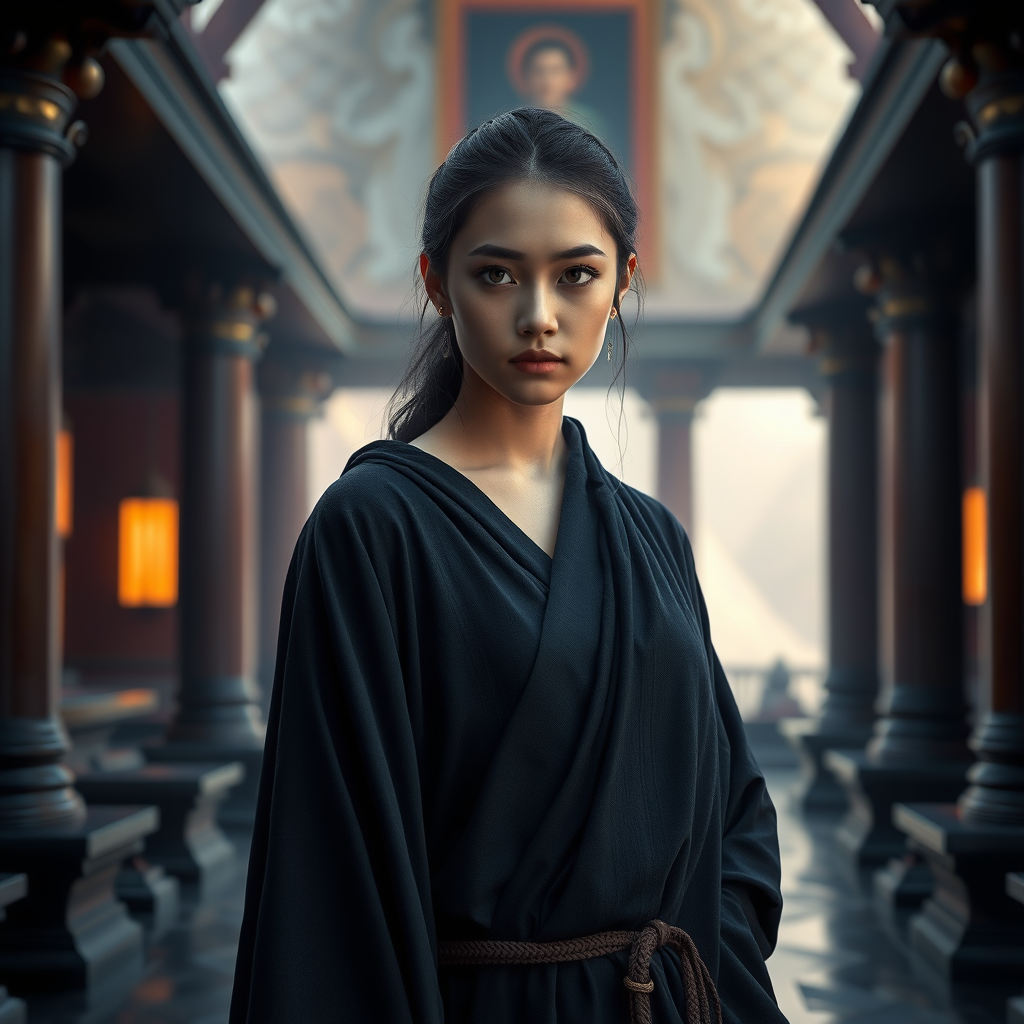 A young woman wearing dark, flowing robes stands in a temple with a captivating background. Her symmetrical eyes are highlighted by dramatic lighting, creating a sense of mystery and intrigue. The scene is captured with sharp focus and HD quality, resembling a highly complex and intricate photograph. The hyperrealistic style is achieved through physics-based rendering, resulting in a high detail RAW color photo. The ultra high resolution image is fit for detailed 8K wallpapers, emphasizing the exquisite craftsmanship of the realistic portrayal. The overall presentation is devoid of errors, maintaining perfect proportions and clarity throughout the composition.