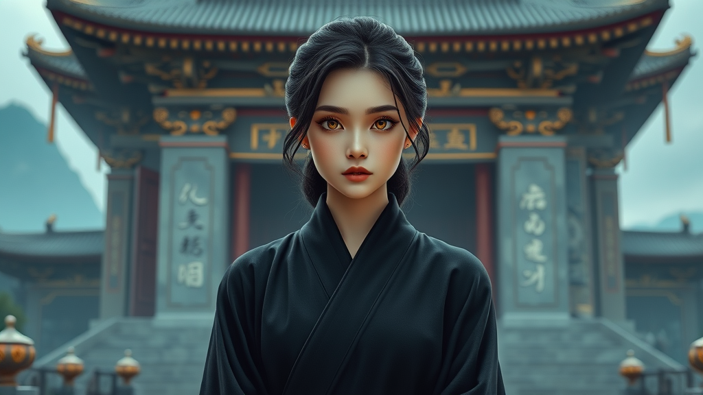 A young woman wearing elegant, dark robes stands against the backdrop of a majestic temple, her symmetrical eyes illuminated by dramatic lighting. Capturing the essence of hyperrealism, the scene is in sharp focus, with photography-like detail, intricate expressions, and a high-resolution finish. The intricacy of the image is enhanced by physics-based rendering, offering a sense of realism akin to a unified 8K digital painting. The artwork is a harmony of CGI elements, blending the styles of cartoons, anime, and digital illustration. Despite the artistic embellishments, the portrayal of anatomy is precise, ensuring no deformities or inconsistencies in proportions. The background and subject seamlessly integrate, offering a mesmerizing visual experience without elements falling out of frame or suffering quality degradation. Every detail, from the texture of the robes to the contours of her face, is meticulously crafted, embodying both the beauty of art and the precision of high-quality digital media.