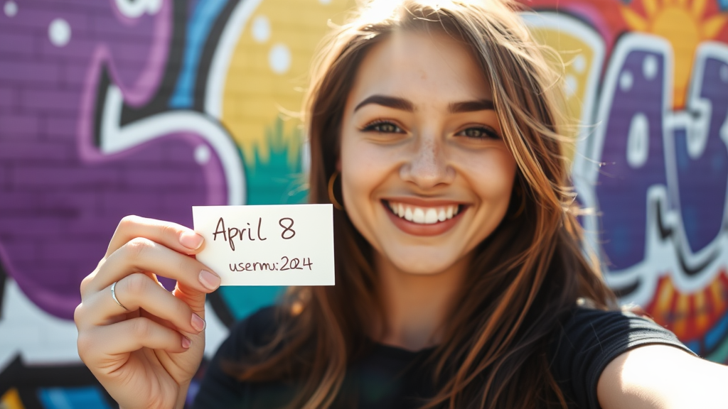 A young woman with a bright smile stands against a colorful mural, holding a small card with the date "April 8, 2024" and the word "username" in neat handwriting, the sunlight catching her hair as she captures the moment in a selfie.