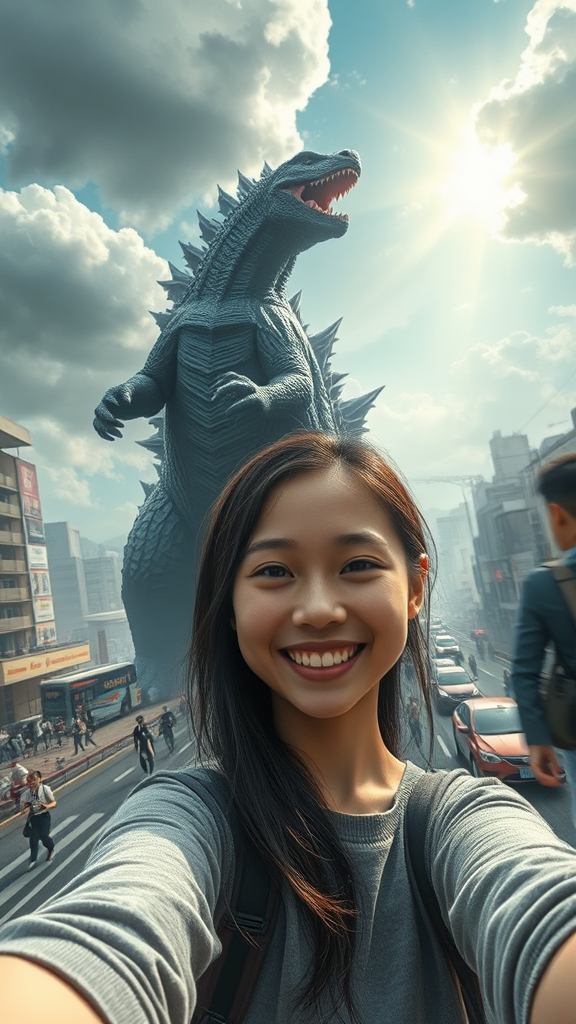 A young woman with a confident smile takes a selfie in the foreground, capturing the chaotic scene behind her where a colossal Godzilla wreaks havoc on a bustling cityscape. The background is a blend of photorealistic detail and whimsical elements, featuring people running and cars in disarray, reminiscent of a collaboration between Beeple's cutting-edge digital artistry and Studio Ghibli's enchanting storytelling. The sky is filled with dramatic clouds and flashes of light, adding a surreal touch to the scene. The selfie juxtaposes modern nonchalance against ancient chaos, where the girl's calm demeanor contrasts sharply with the apocalyptic events unfolded behind her.