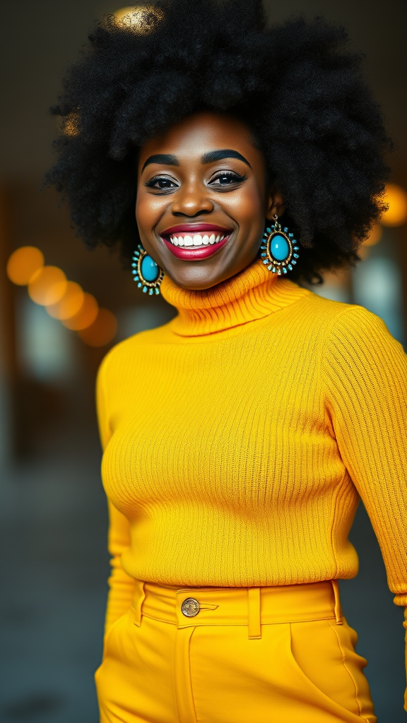 A young woman with a joyful expression and a rich dark complexion, her hair styled in a voluminous afro. She wears a vibrant yellow turtleneck sweater paired with striking bell-bottom flares, both featuring playful pops of yellow and cyan tones reminiscent of a 1970s hip pop vibe. Her look is accentuated by large statement earrings that catch the light. Captured in stunning cinematic lighting, her image is filled with high-frequency details and the nostalgic charm of 35mm film. The scene is imbued with authentic film noise, reminiscent of Kodak ProImage 100, creating a captivating depth of field and beautifully blurred bokeh in the background.