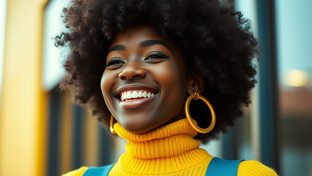 A young woman with a joyful expression and dark skin tone, showcasing her vibrant afro hair, is dressed in a yellow turtleneck sweater. Her look is complemented by oversized earrings, and she wears stylish bell-bottom flares. The style is reminiscent of a 1970s hip-hop vibe in yellow and cyan tones. Captured with a cinematic flair, the scene is filled with high-frequency details and the distinct depth of field of a 35mm film, featuring the characteristic film noise of Kodak ProImage 100. Soft bokeh enhances the background, adding to the overall nostalgic and artistic vibe.