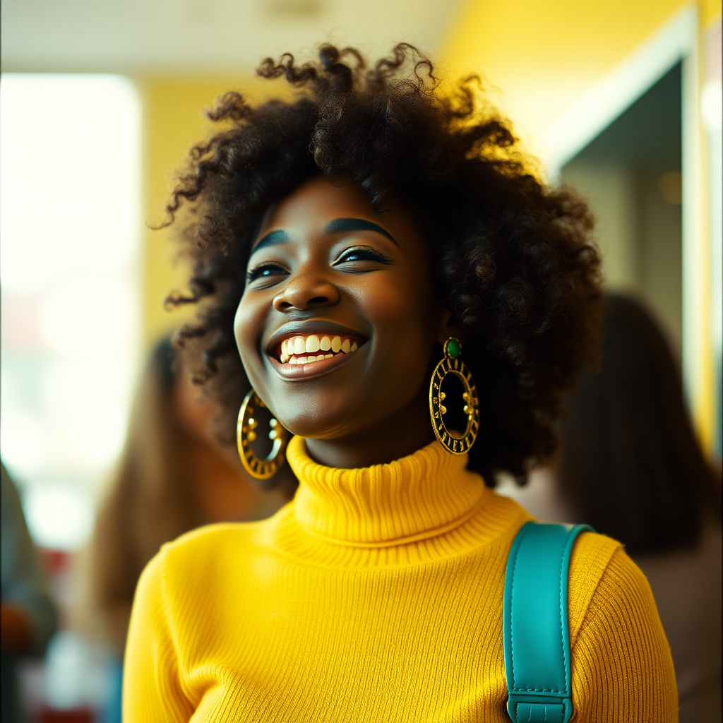 A young woman with a joyful expression, deep brown skin, and a voluminous afro hairstyle, wearing a bright yellow turtleneck sweater. Her look is vibrant with a mix of yellow and teal tones reminiscent of the 1970s hip hop era. She sports large statement earrings and fashionable bell-bottom flares. The scene is captured with cinematic lighting and rich detail, resembling a 35mm film photograph with subtle film grain, specifically inspired by Kodak Proimage 100. The image features a shallow depth of field, creating a soft bokeh effect in the background.