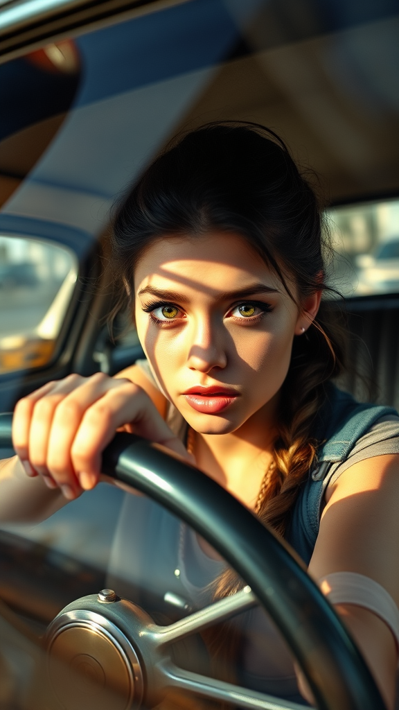 A young woman with a look of intense emotion grips the steering wheel of a vintage car, her eyes wide and filled with determination, as streaks of sunlight filter through the car window, casting dramatic shadows across her face and the dashboard. The interior reflects a mix of retro style and personal chaos, with scattered notes and a sense of urgency in the air.