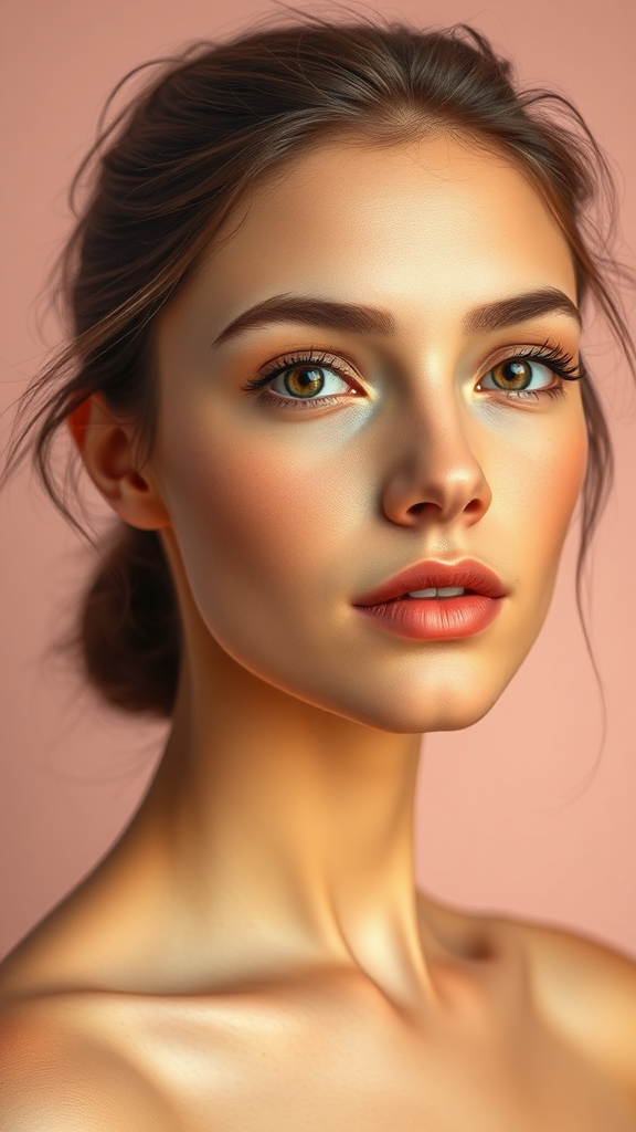 A young woman with a precisely lifelike appearance, featuring distinctive nose, light pink and light amber hues, crafted in a Maya-inspired style, reminiscent of Velvia tones, exuding a calm and serene beauty with flawless line work, aspect ratio 71:128, heightened stylization.