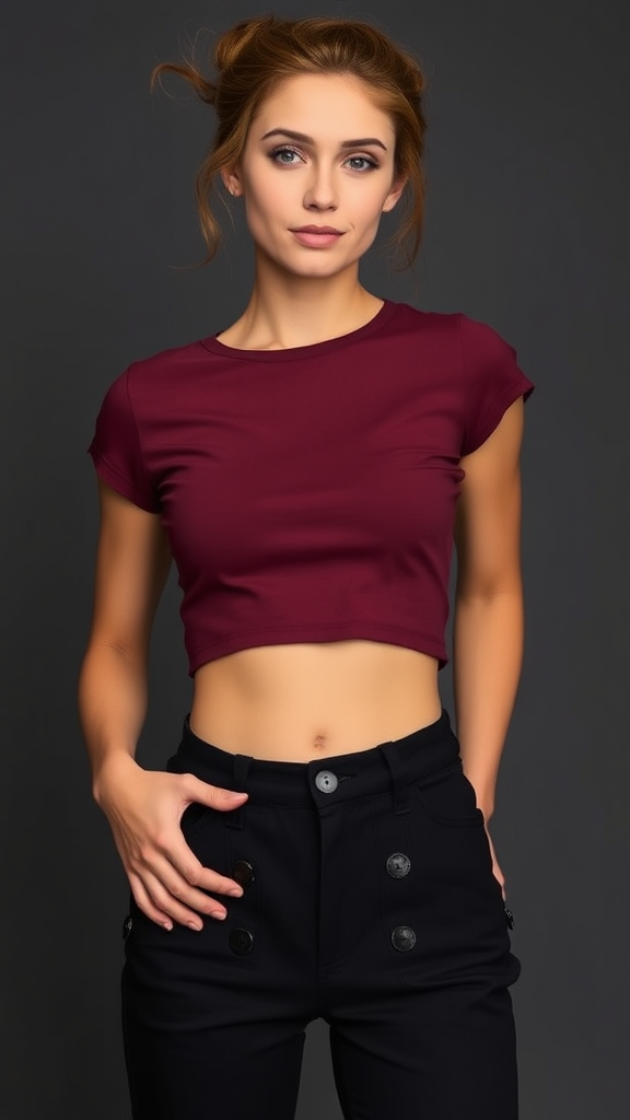 A young woman with a warm complexion and chestnut-colored hair styled in a relaxed bun with tendrils framing her face. Her makeup is understated with attention to her eyes and a subtle nude lip. She wears a fitted, cropped burgundy T-shirt with cap sleeves, paired with high-waisted black trousers featuring distinctive button embellishments. She stands with confidence, one hand on her hip while the other playfully tugs at her waistband. The lighting is soft and frontal, accentuating her features and the fabric texture against a muted charcoal backdrop.