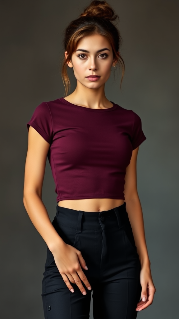 A young woman with a warm medium complexion and chestnut hair styled in a relaxed bun, with a few loose strands framing her face, exudes confidence. Her makeup is understated and natural, with emphasis on her expressive eyes and a subtle nude lip color. She is dressed in a snug, cropped deep burgundy tee with cap sleeves and high-waisted black trousers adorned with unique button accents. She stands poised, her hand resting on her hip while the other grazes her trousers. The light is gentle and direct, accentuating her features and the texture of her attire against a softly muted shadowy backdrop.