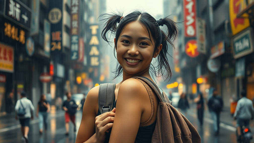 A young woman with a warm smile stands on the street, her backpack slung over one shoulder. Her hair is tied in playful ponytails, and the scene around her is epic and realistic. She appears soaked, as though caught in a sudden rain, with neutral tones dominating the scene. The background is intricate, filled with complex and detailed structures that seem to surround her in a vignette of activity. The photo has a faded, cinematic warmth, capturing the dramatic interplay of light and shadows. The scene is hyperdetailed, showcasing an epic realism with warm lights that enhance the overall drama. Despite the bustling complexity around her, she remains a central figure, undistorted and naturally integrated into the scene.