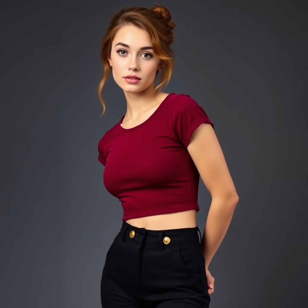 A young woman with a warm, sun-kissed complexion and chestnut-colored hair styled in a relaxed, tousled bun with soft, loose tendrils framing her face. She has a fresh, natural makeup look with expressive eyes and a subtle rose-tinted lip. She is wearing a snug, cropped burgundy T-shirt with cap sleeves and high-waisted black pants accented with eye-catching gold button details. She stands with poise, her posture confident, one hand resting casually on her hip while the other delicately grazes the buttons of her pants. The lighting is gentle and even, illuminating her features and the texture of her clothing, set against a smooth, deep gray backdrop.