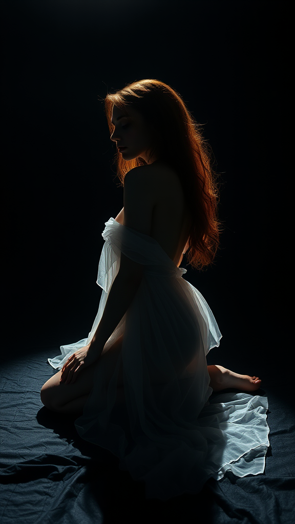 A young woman with alabaster skin and cascading auburn locks kneels gracefully on a dark, textured surface, her delicate, gauzy white dress caressing her form. She is depicted in a shadowy, pensive pose, eyes gently shut in serene reflection. A singular, focused beam of light from above and slightly behind her casts striking shadows, accentuating the gentle arc of her spine and the sheer fabric. The camera is positioned low, amplifying her ethereal allure against the deep black backdrop. The scene is enveloped in high-contrast, volumetric lighting with a gentle halo effect, evoking a sense of vulnerability and otherworldly tranquility. Symbolist chiaroscuro and dramatic shadow techniques, paired with a fine film grain and a cool teal and warm amber color grading, infuse the image with depth and texture. The lighting setup incorporates a soft, golden spotlight angled at 45 degrees, casting a cozy glow that accentuates her features and creates a rich dynamic range.