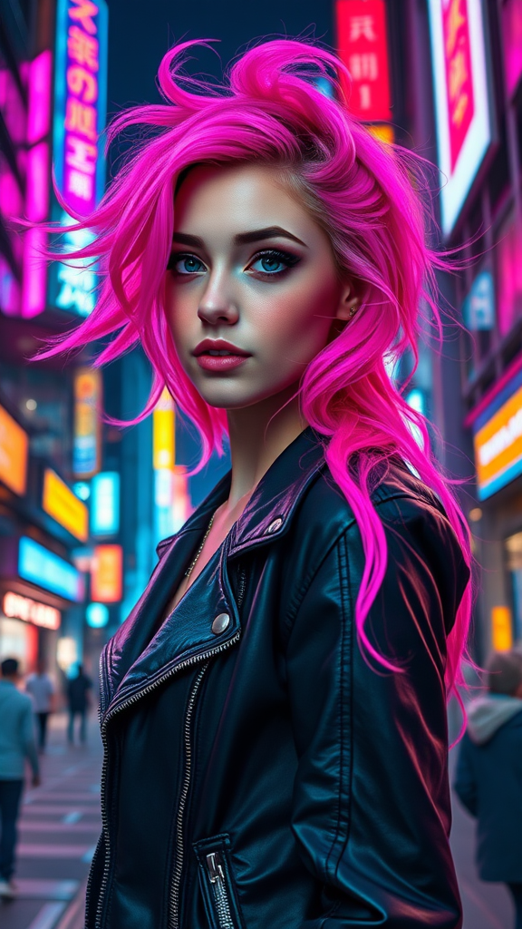 A young woman with an adorable face and dreamy, captivating eyes is wearing a sleek black jacket. Her vibrant, neon pink hair cascades whimsically, capturing the essence of a cyberpunk aesthetic. She stands outdoors on a bustling city street, surrounded by the glow of neon lights reflecting off futuristic architecture, creating a striking contrast against the night sky. The scene is photorealistic, with incredible detail and depth, capturing the essence of a lively urban landscape in 8k resolution, maintaining a cinematic 9:16 aspect ratio with a vivid saturation of colors.