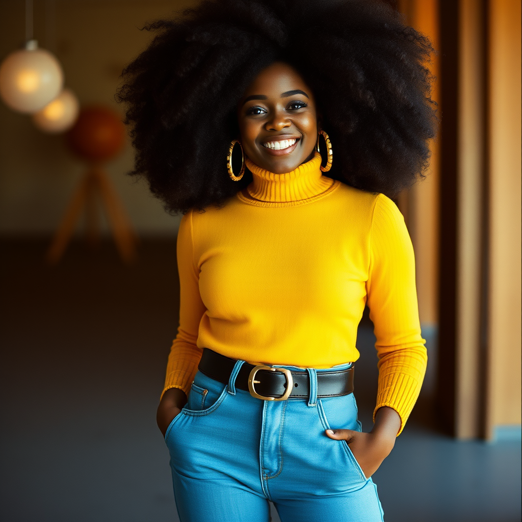 A young woman with an exuberant expression and rich dark skin stands confidently, her voluminous afro hair complementing her vibrant style. She's dressed in a striking yellow turtleneck sweater, paired with bell-bottoms that echo the groovy fashion of the 1970s. The color palette of yellow and cyan highlights her outfit, while oversized earrings add a touch of hip pop flair. Captured in cinematic lighting with high frequency details, the scene is reminiscent of vintage photography, shot on 35mm film with subtle film noise, embodying the essence of Kodak ProImage 100. The depth of field creates a pleasing bokeh effect, further enhancing the image as a true masterpiece.