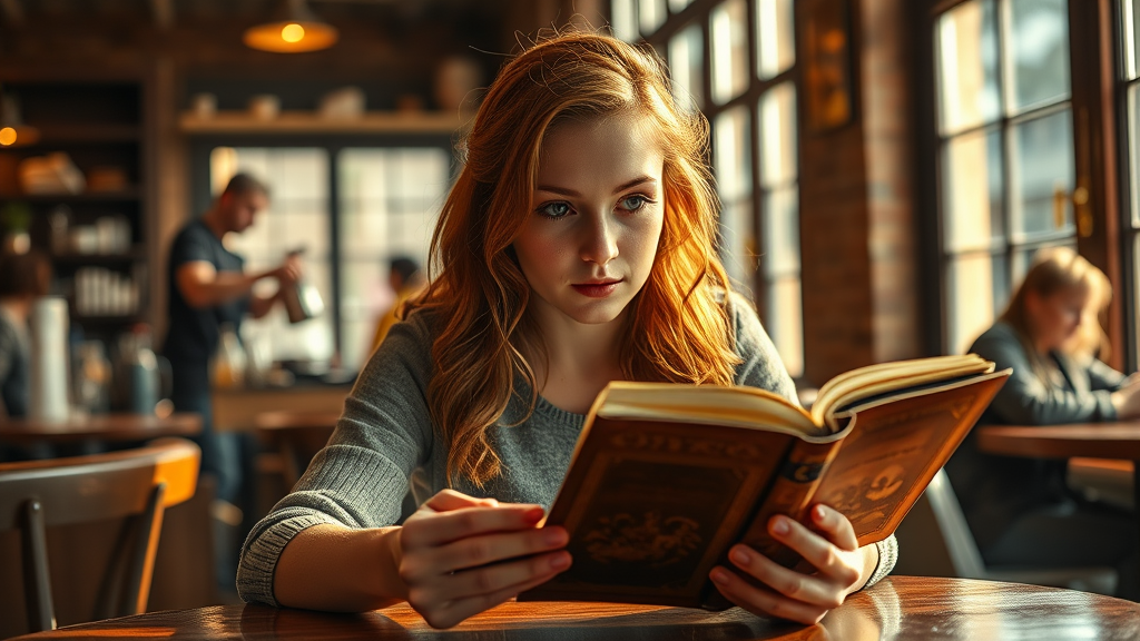 A young woman with auburn hair sits at a table in a cozy coffee shop, absorbed in an old, leather-bound book. The ambient hum of the café surrounds her as she turns the pages, her eyes wide with fascination. Soft, golden light filters through the large windows, casting cinematic shadows across her face. The barista in the background pours a cup of steaming coffee, and the gentle clink of porcelain adds to the atmosphere. Her expression suggests she's not just reading but discovering something profound, with the rich textures and vibrant colors captured in exquisite detail by the DSLR, bringing the scene to life.