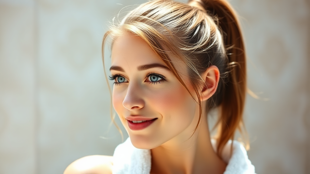 A young woman with caramel brown hair tied in a high ponytail gazes softly with sparkling blue eyes and a hint of red on her smiling lips. She has a white towel draped elegantly over her shoulders, accentuating her radiant, glowing skin under the gentle play of natural light. The background is softly blurred, evoking a peaceful and intimate ambiance, with subtle hints of muted pastel colors blending harmoniously.