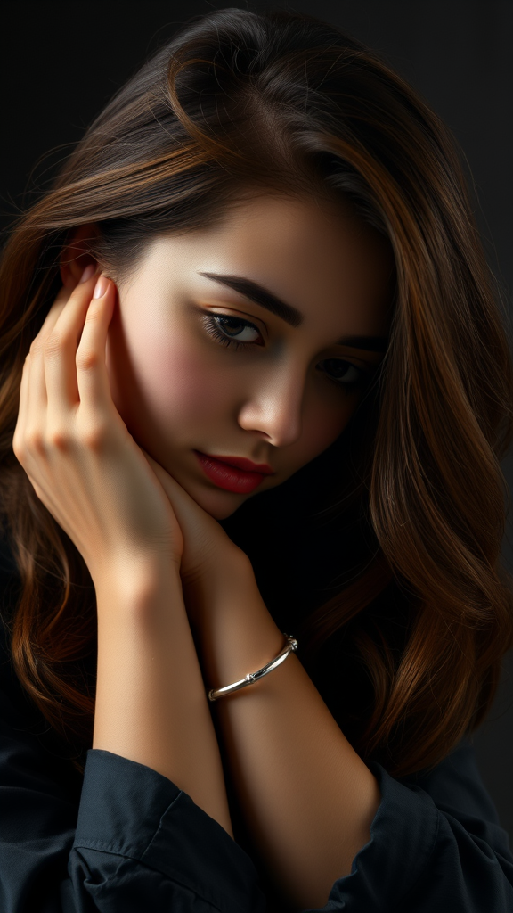 A young woman with cascading chestnut waves gently cradles her head in her entwined fingers. She wears a charcoal blouse and a slender silver bracelet on her right wrist. Her gaze is serene and introspective, accentuated by understated makeup and a hint of coral on her lips. The backdrop is dim and softly out of focus, drawing attention to her tranquil expression and graceful hands.