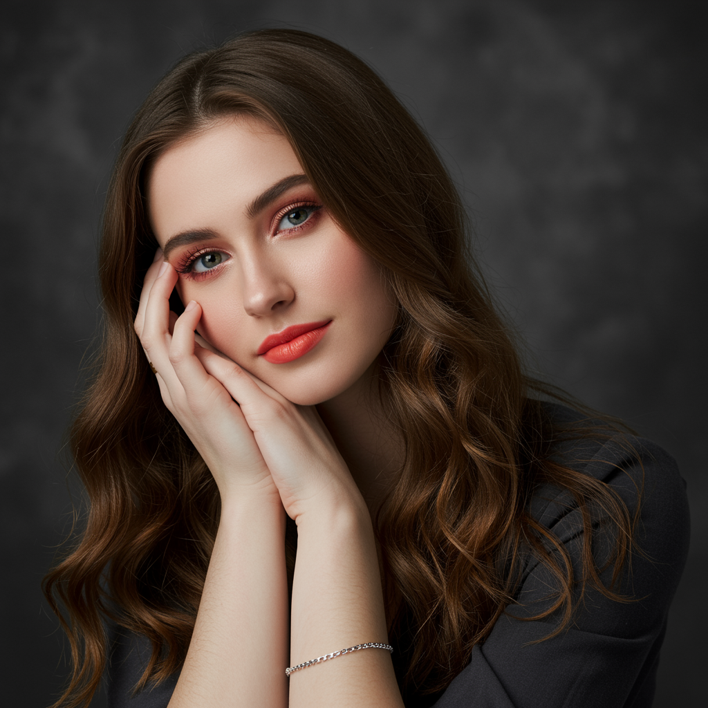 A young woman with cascading chestnut waves leans her head gently on her interlocked fingers. She adorns a charcoal blouse and a slender silver bracelet encircles her right wrist. Her gaze is serene and introspective, enhanced by understated makeup and a hint of coral lipstick. The backdrop is a muted shadowy blur, drawing attention to her tranquil visage and graceful hands.
