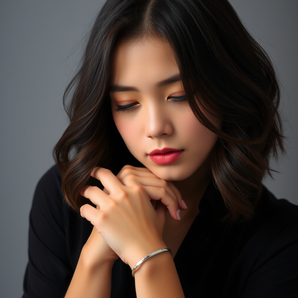 A young woman with cascading, shoulder-length brunette curls gently rests her head on her intertwined fingers. She wears a simple black blouse and a slender silver bracelet on her left wrist. Her expression is serene yet introspective, accentuated by natural makeup and a hint of rose-tinted lip gloss. The background is a soft, shadowy blur, drawing attention to the delicate details of her face and hands.