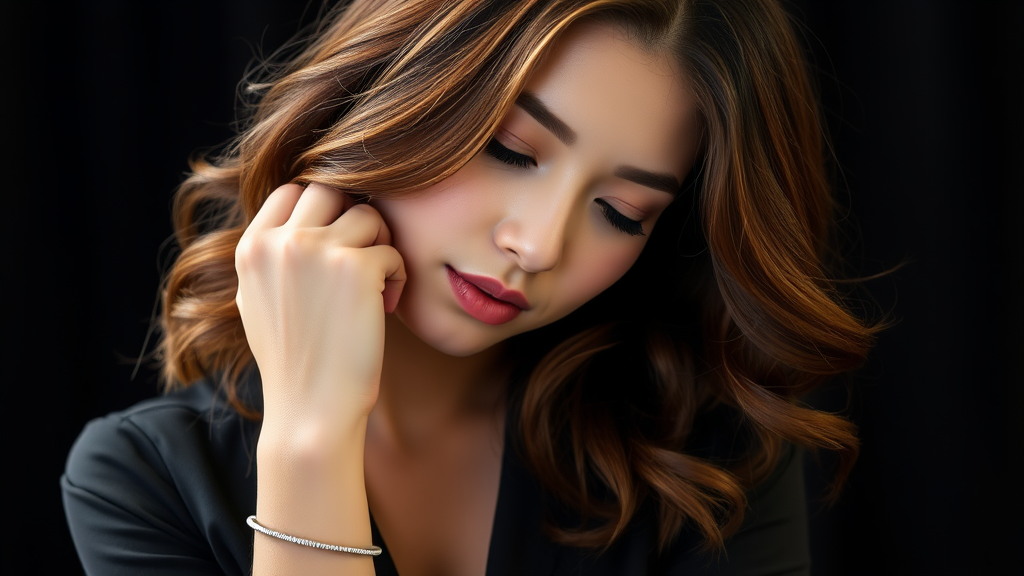 A young woman with cascading wavy chestnut hair gently rests her head on her intertwined fingers. She is dressed in a sleek black blouse, accented by a slender silver bracelet on her right wrist. Her expression is gentle and introspective, highlighted by a touch of natural makeup and soft coral lipstick. The backdrop is a deep, blurred ambiance, drawing attention to her serene face and graceful hands.