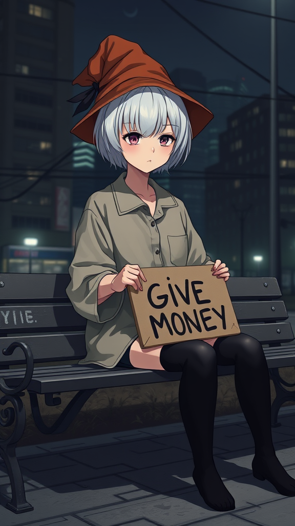 A young woman with cute, short white hair sits alone in a city park at night, wearing an oversized shirt and a wizard hat. Her expressionless face is partly shaded, and she has empty eyes. She relaxes on a bench, dressed in long socks and black thigh highs, paired with shorts. Holding a sign board that says "GIVE ME MONEY," she gazes blankly into the distance. The scene features a depth of field effect, capturing the serene yet somber cityscape around her. Despite the darkness, the artwork shines with a 2D masterpiece quality, exuding an air of stillness and subtle melancholy.