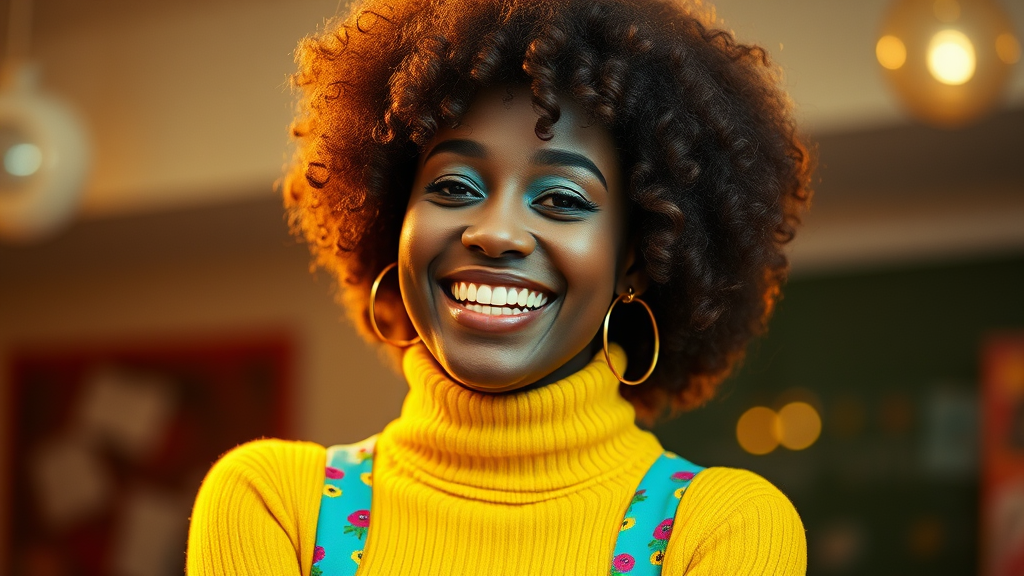 A young woman with dark skin, radiating happiness, sports a vibrant afro hairstyle. She wears a bright yellow turtleneck sweater and colorful bell-bottoms that showcase a playful yellow and cyan palette reminiscent of the 1970s hip pop era. Her look is completed with oversized hoop earrings, capturing the essence of the period. The scene is captured in cinematic lighting, emphasizing high-frequency details, with a warm film noise overlay reminiscent of Kodak ProImage 100. Shot on 35mm film, there is a distinct depth of field and beautiful bokeh that enhances the vintage, masterpiece appeal.