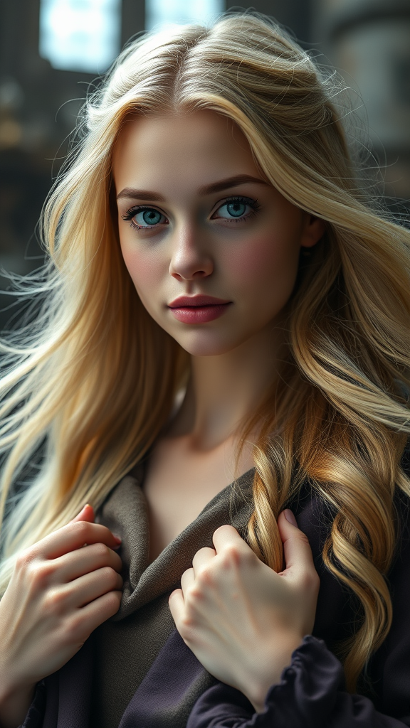 A young woman with flowing blonde hair in Hogwarts, wearing a witch's fabric, captured in an 8k ultra-realistic photo with cinematic lighting. The focus is hyperrealistic, showcasing high details and depth of field. Captured with an 85mm lens at f/1.8, the style is inspired by the artistry of Artgerm, Greg Rutkowski, and Alphonse Mucha. The image avoids deformation and maintains excellent anatomy, presenting an exquisite, beautifully drawn face and hands. Absent are the problems of mutation or disfigurement; instead, it highlights elegance and grace, with seamless, well-connected limbs. The scene is not blurry or oversaturated, ensuring that the lighting and shadows enhance the realism. The composition is free from any watermarks or distortions, resulting in a refined and artistic portrayal.