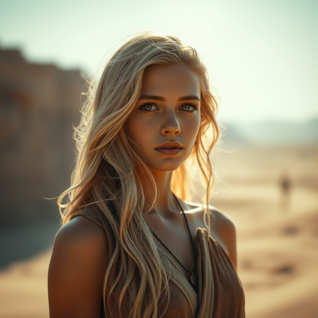 A young woman with flowing blonde hair stands in the vast desert, enveloped in a sci-fi ambiance. The scene is captured with cinematic ultra-realism, showcasing intricate details in 8k high resolution. The setting features dramatic depth of field, emphasizing her focused expression. The lighting casts a cinematic glow, highlighting her features. Inspired by the art styles of Artgerm, Greg Rutkowski, and Alphonse Mucha, the visual composition blends realism with an artistic oil paint texture. The landscape is reminiscent of an otherworldly Egypt, with surreal elements.
