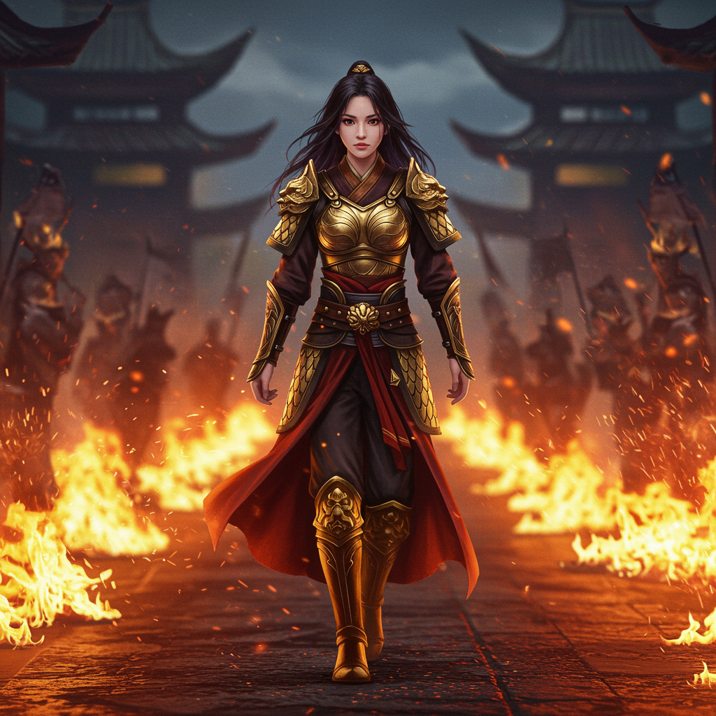A young woman with flowing dark hair and resplendent golden armor strides confidently across a path of flames. Her expression is one of determination and poise, embodying both strength and elegance. The scene is a harmonious fusion of Eastern aesthetics reminiscent of traditional Chinese painting and the dynamic, vivid flair of modern pop art styles, such as those of Tristan Eaton and Skottie Young. The interplay of colors and textures evokes a sense of boldness and gracefulness, akin to the emotive artistry of Michael Malm. The atmosphere is cinematic, with the visual fidelity of a high-end digital engine.