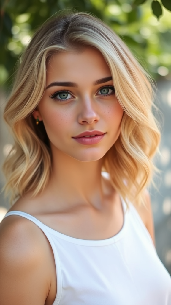 A young woman with golden blonde wavy hair and light green eyes stands in a quiet setting. Her skin is smooth, adorned with a sprinkle of freckles over her nose and cheeks. Her expression is thoughtful as she looks at the viewer. She wears minimal makeup emphasizing her eyes, and a pair of delicate gold or emerald earrings. Dressed in a simple white sleeveless top, she is framed against a gentle, leafy outdoor background. Soft, natural light accentuates her features, creating a tranquil atmosphere.