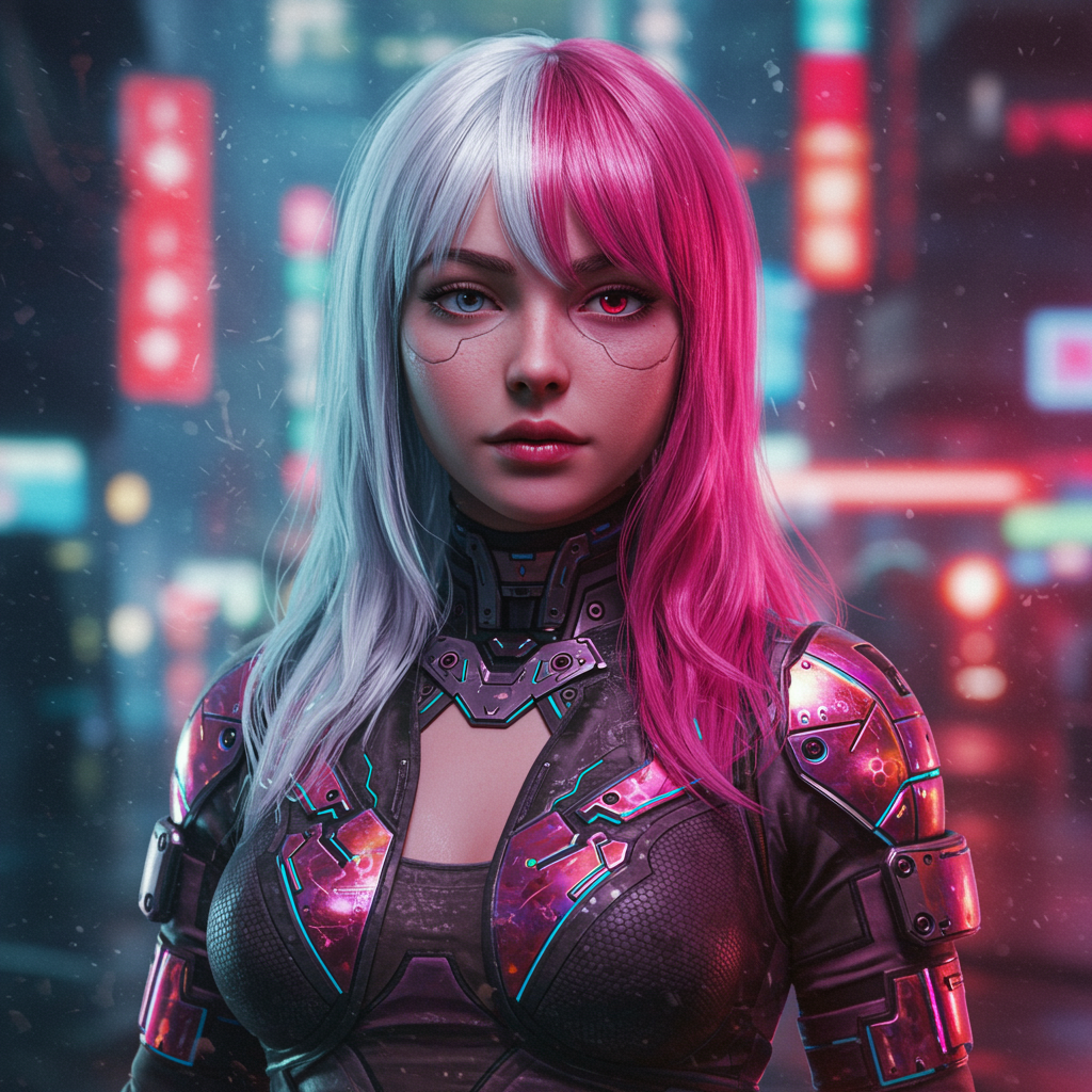 A young woman with half white and half pink hair stands solo in a bustling cyberpunk city. She is adorned in vibrant, intricately designed armor that reflects the colorful neon lights of the surrounding urban landscape. The atmospheric setting is brought to life with dramatic lighting and a photorealistic touch, as if captured through a cinematic lens. Her expressive face is captured in stunning detail, highlighting textured skin and remarkably detailed pupils. The focus is sharp, with a realistic depth of field that draws attention to her presence amidst the cybernetic backdrop. The scene is vividly rendered as if processed with the finest visual technology, showcasing a scene that is both raw and cinematic.