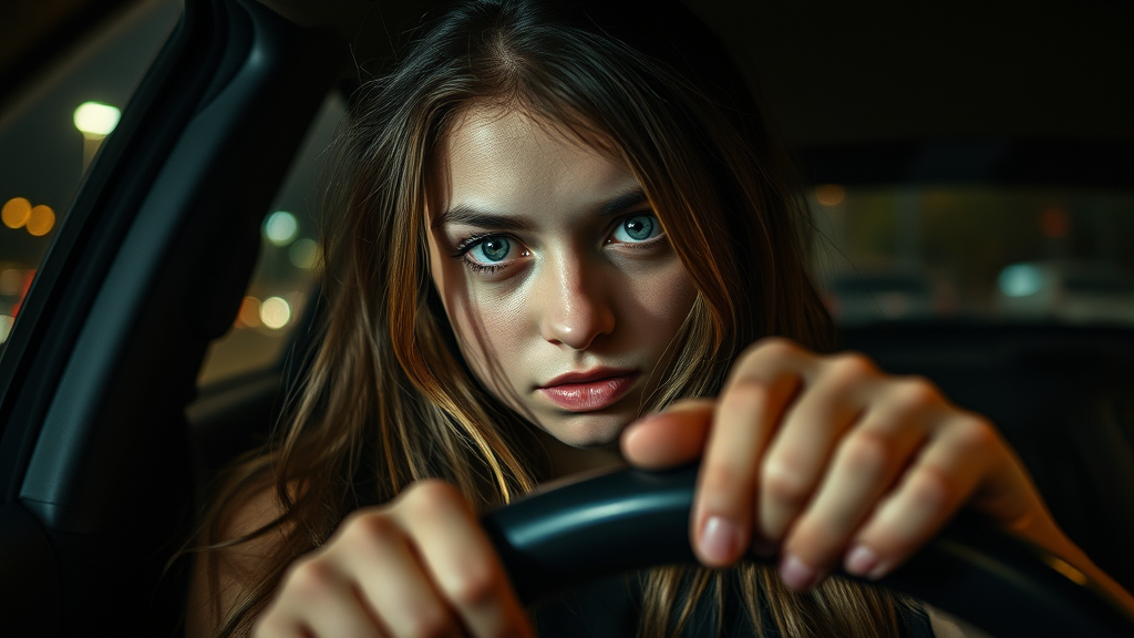 A young woman with intense, wide eyes grips the steering wheel tightly, her knuckles white against the dark interior of the car. Her long hair falls in disarray around her shoulders, capturing the chaos of her emotions. The streetlights cast a dramatic interplay of shadows and light across her face, highlighting the determination mixed with desperation in her expression. The car's dashboard glows softly, hinting at a tense, late-night drive through an uncertain path.
