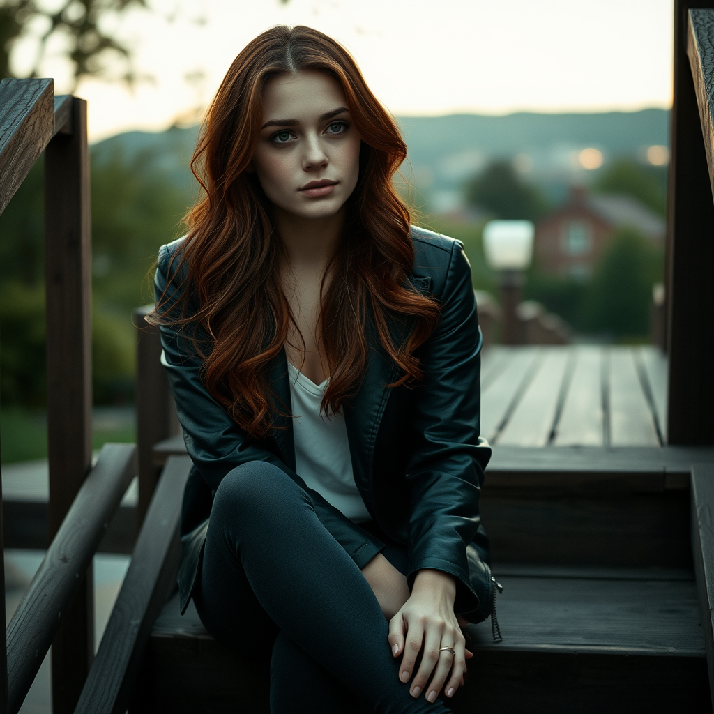 A young woman with long auburn hair styled in loose waves sits on a rustic wooden staircase, her legs stretched out and one arm draped casually over her knee. She wears a dark green leather jacket over a white top and has an introspective, thoughtful expression as she gazes slightly past the camera. The background reveals a blurred outdoor setting with lush trees and distant buildings enveloped in soft, natural light. The scene is captured with a shallow depth of field, accentuating the woman's features. The lighting is soft, with a warm, twilight glow casting a gentle radiance on her face and hair. The image carries a cinematic quality, reminiscent of a film noir aesthetic, with subtle grain and a muted, slightly cool color palette that enhances the contemplative and introspective atmosphere.