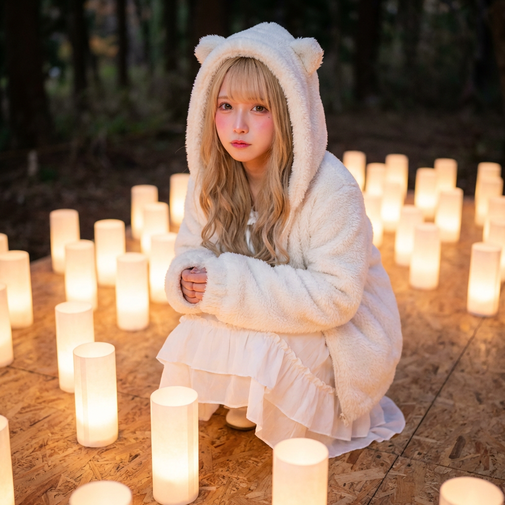 A young woman with long blonde hair and bangs, wearing a fluffy white hooded coat with animal ears and a white ruffled dress, kneeling and looking directly at the viewer with her hands clasped. She has heavy pink blush and light pink lipstick. The scene is dark, lit by numerous glowing white cylindrical lanterns on wooden chipboard platforms. The lighting is soft and warm, casting a gentle glow on her face and the immediate surroundings. The atmosphere is mysterious and ethereal. Photorealistic, soft focus, high detail, warm color palette with strong contrast between light and shadow.
