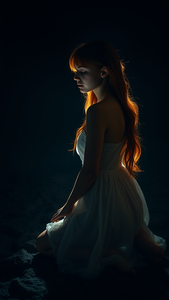 A young woman with luminous, porcelain skin and long, cascading auburn hair kneels on a deep, textured surface, her gauzy ivory dress softly hugging her graceful form. She is captured in a shadowy, introspective pose, her eyes gently shut in serene reflection. A singular, focused light from above and slightly behind her creates dramatic shadows, accentuating the elegant curve of her spine and the delicate material. The camera is positioned low, highlighting her ethereal allure against the dense darkness. The scene is enveloped in high-contrast, volumetric lighting with a subtle halo effect, evoking a sense of vulnerability and otherworldly tranquility. Influences of Symbolist chiaroscuro and tenebrist techniques, along with a touch of film grain and teal and orange color grading, add rich layers and texture. The lighting arrangement features a soft, warm spotlight at a 45-degree angle, casting a gentle glow that accentuates her features and produces a striking dynamic contrast.