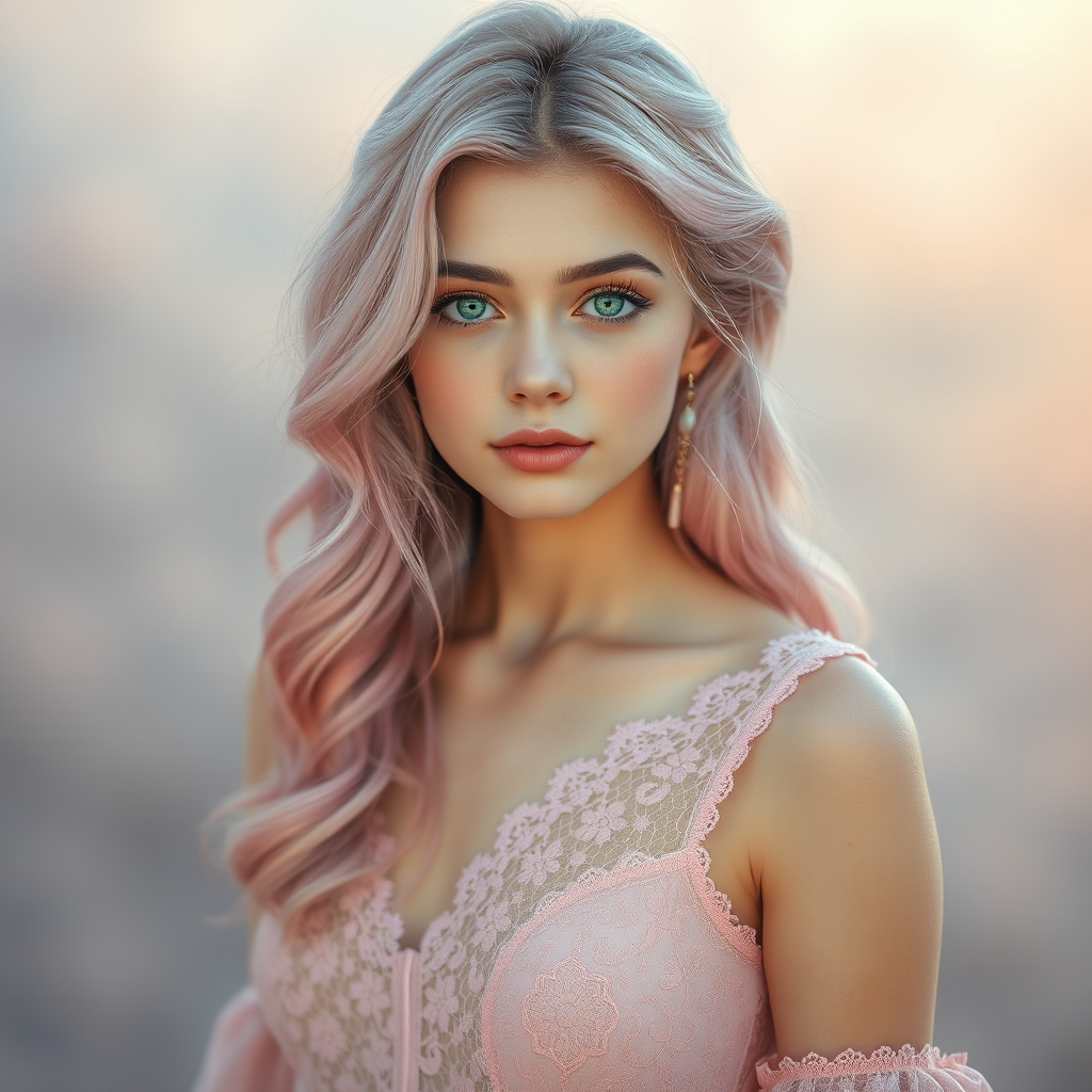 A young woman with pastel pink hair cascading in gentle waves, dressed in a delicate pink lace dress, stands in a dreamy, soft-focused setting. The scene is rendered in hyperrealistic detail with an emphasis on photorealism, capturing the fine textures of the lace and the subtle play of light on the fabric. The color palette is dominated by soothing pastels, evoking a babycore aesthetic, and the overall composition has an elongated portrait aspect ratio, suggesting elegance and grace. Her expression is serene, and her eyes, the color of a clear summer sky, reflect a sense of wonder. The background is a blurred blend of soft colors that complement her outfit, adding to the serene and ethereal ambiance of the image.