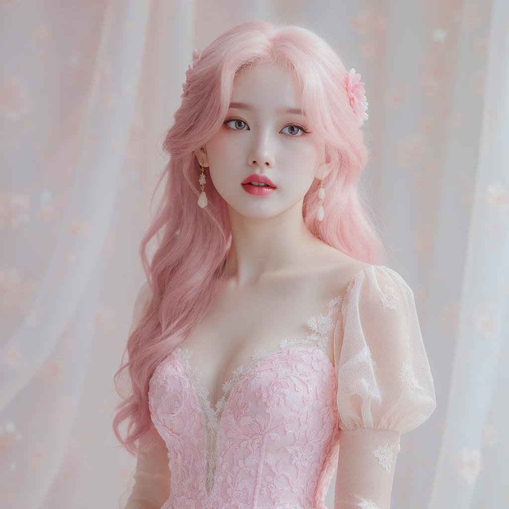 A young woman with pastel pink hair styled in soft waves, dressed in an intricate pink lace dress that flows elegantly. The scene captures the essence of hyperrealism and photorealism, with a UHD quality that highlights every delicate detail. The background features a gentle, soft-focus, enveloping her in a calming pastel palette reminiscent of babycore aesthetics, with a touch of whimsical charm. Her expression is serene and thoughtful, perfectly complementing the dreamlike ambience of the composition.