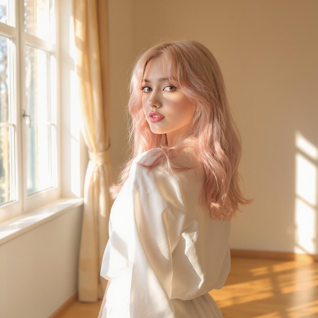 A young woman with pastel pink hair wearing a crisp white blouse stands in a sunlit room, the warm light highlighting the delicate strands of her hair.