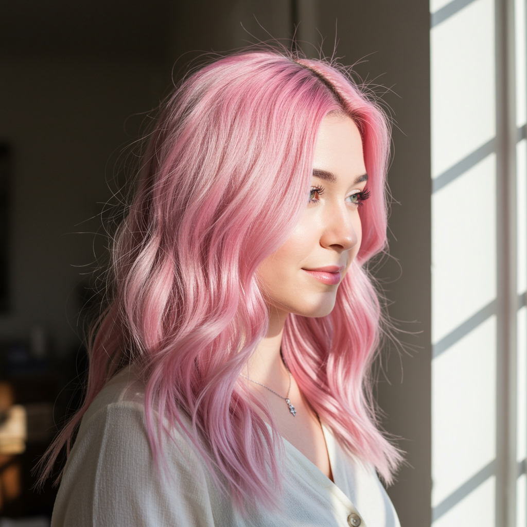 A young woman with pastel pink hair wearing a soft white blouse, standing in a sunlit room, with a gentle smile and a glimmer of curiosity in her eyes. Her hair cascades in loose waves, and the sunlight highlights the various shades of pink, adding depth and a touch of whimsy to her appearance.