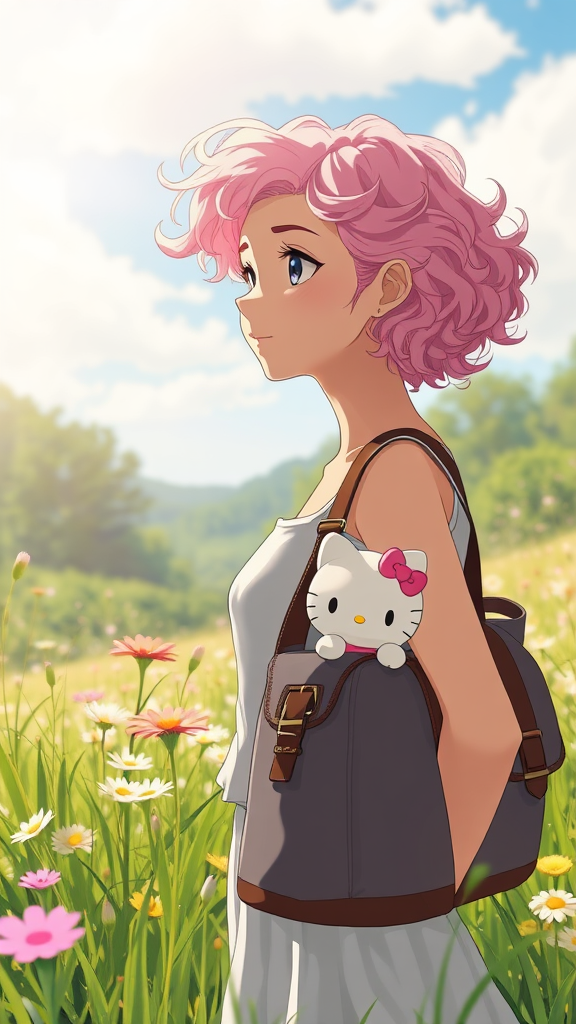 A young woman with pink and blonde curly short hair stands in a sunlit meadow, surrounded by a whimsical atmosphere. Her relaxed demeanor is set against a serene backdrop of blooming flowers and gentle breezes. A Hello Kitty plush peeks out of her satchel, adding a touch of playful charm to the scene. The setting is richly detailed, capturing the essence of nature's beauty with vibrant colors and intricate textures. The style is reminiscent of Studio Ghibli, with a focus on enchanting landscapes and a touch of fantasy.