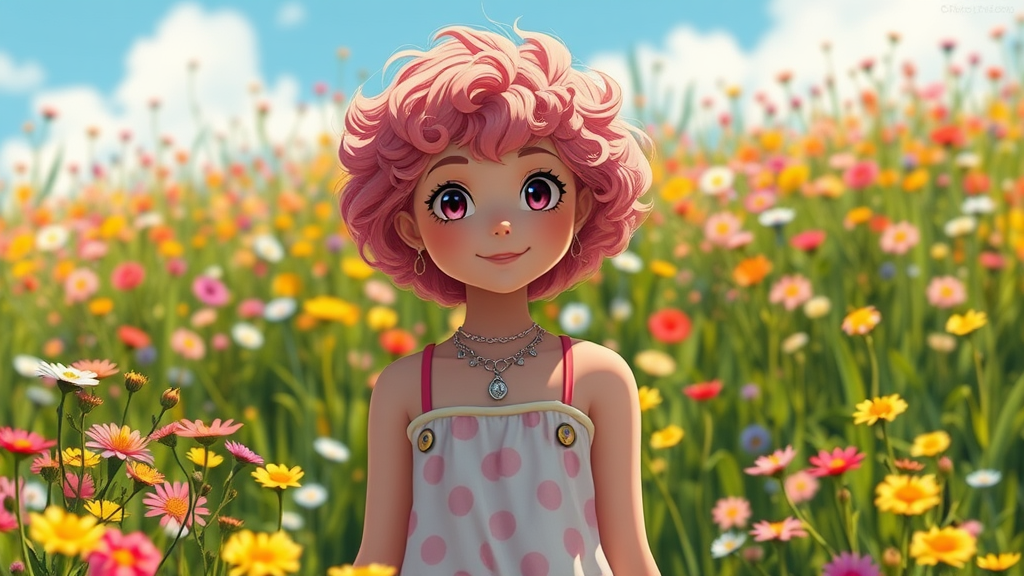 A young woman with pink and blonde short curly hair stands in a vibrant meadow, surrounded by colorful wildflowers. The scene captures a whimsical sense of wonder and joy with subtle nods to Hello Kitty seen in her playful accessories. The atmosphere is serene, with the soft hues of a Studio Ghibli animation style bringing the scene to life in exquisite detail, evoking a feeling of peaceful relaxation and gentle whimsy.